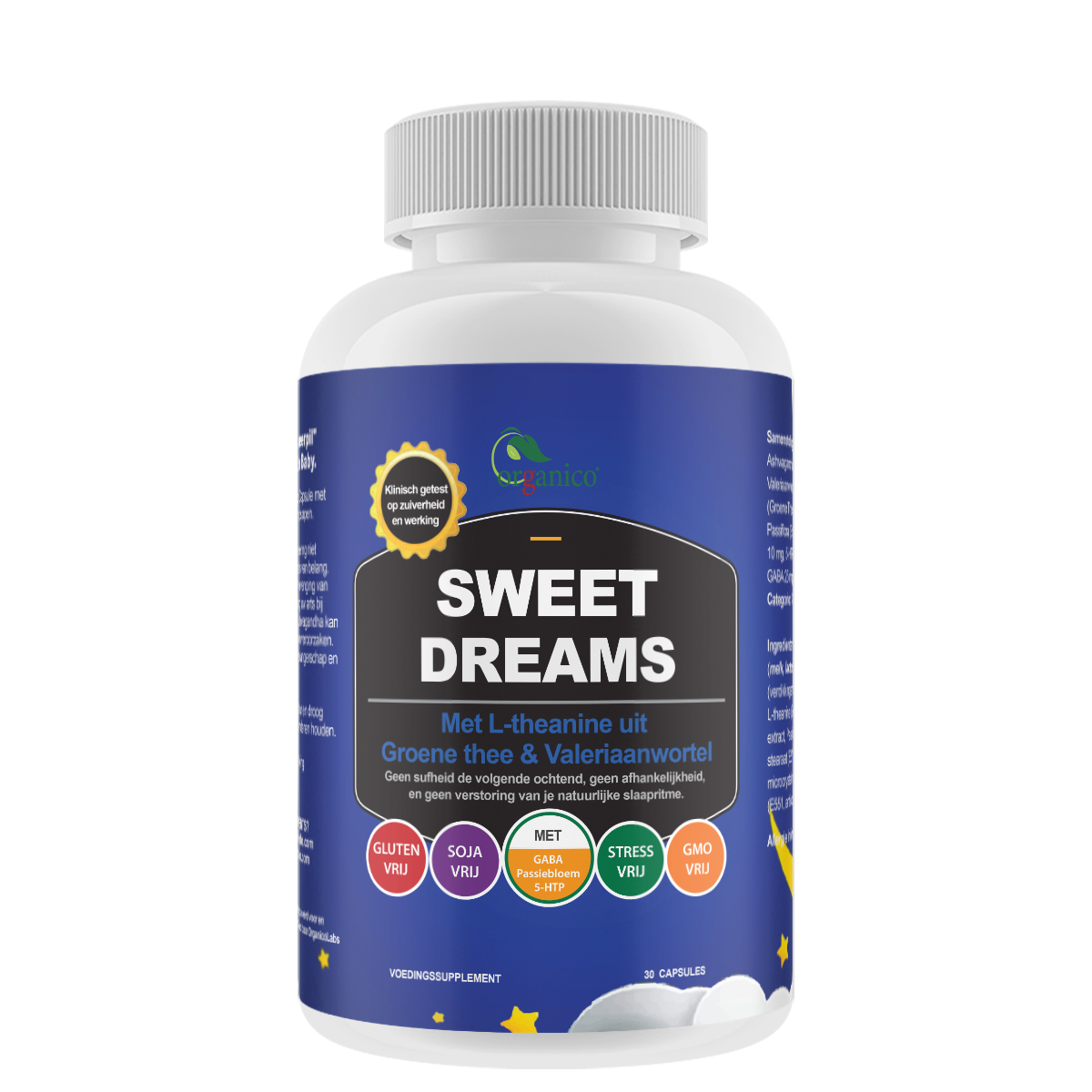 Organico's Sweet Dreams™ bevat een krachtige combinatie van ingrediënten, waaronder een geconcentreerde vorm van Valeriaanwortel, evenals traditionele kruiden, L-theanine, Kamille, Passiflora, Hop, 5-HTP en GABA.
